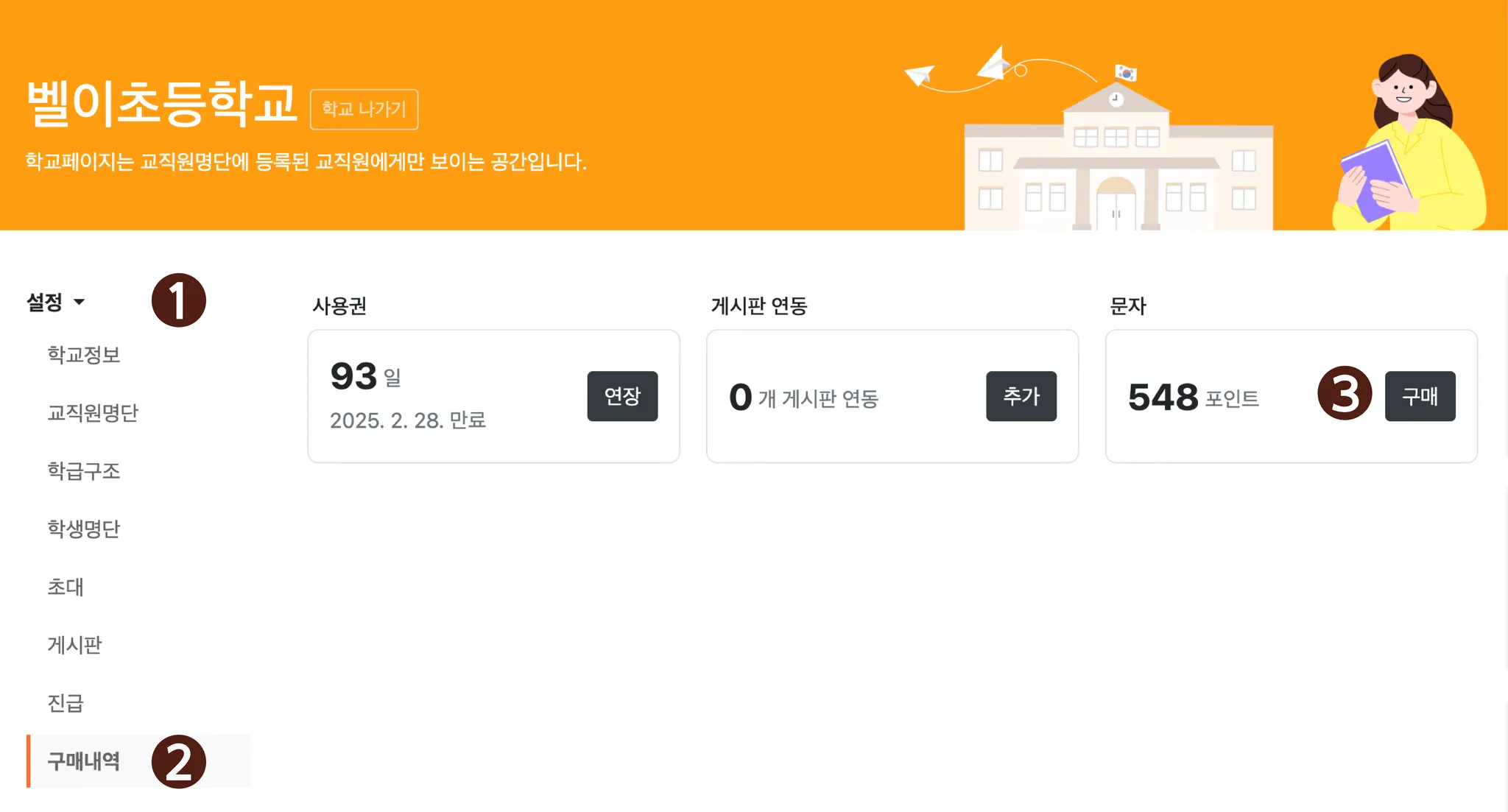 학교페이지에서 ❶설정 > ❷구매내역 > ❸문자 구매 눌러주세요.