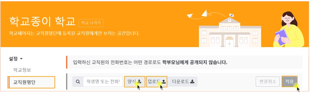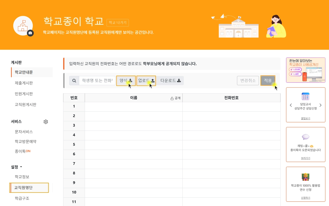 학교페이지 > 교직원명단 > ‘양식’을 클릭하여 다운 받은 엑셀양식에 교직원 이름 및 휴대폰번호를 입력 후 업로드 > ‘적용’버튼을 누릅니다.