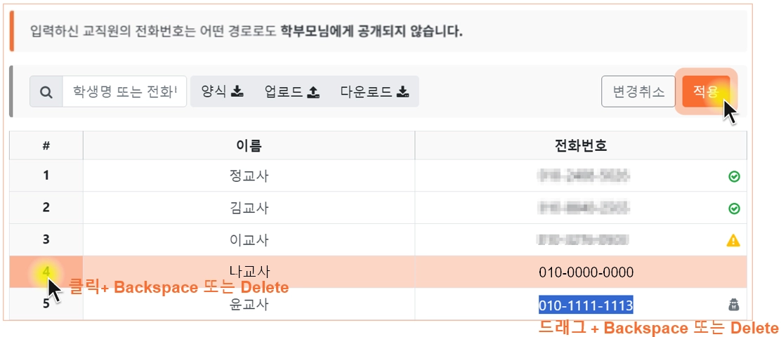 교직원명단 화면에서 빈 칸에 이름과 휴대폰번호를 입력한 후 ‘적용’을 눌러 등록하거나,