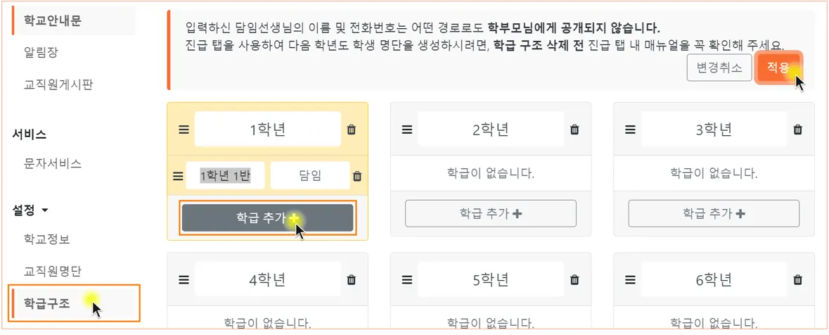 1. ‘학급구조’탭에서 ‘학급추가’를 눌러 학년별 학급을 개설합니다.