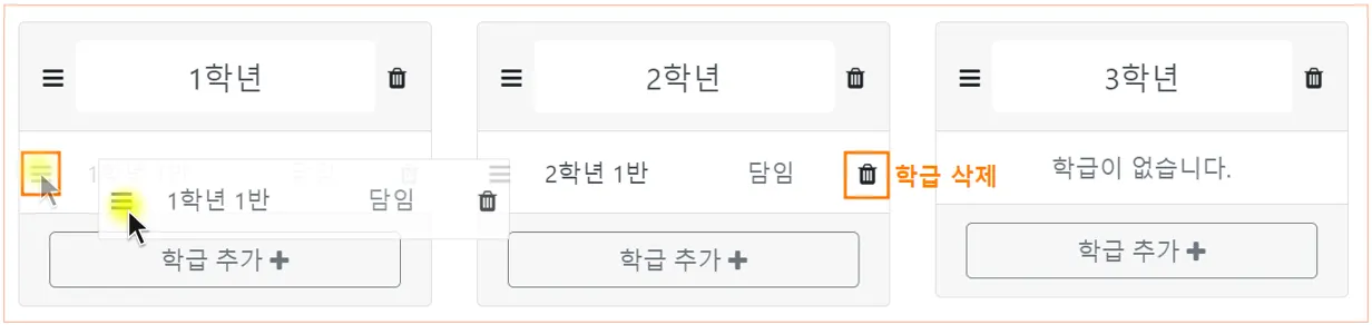 삼선버튼을 마우스로 끌어 학년(그룹) 및 반의 순서를 변경할 수 있습니다.