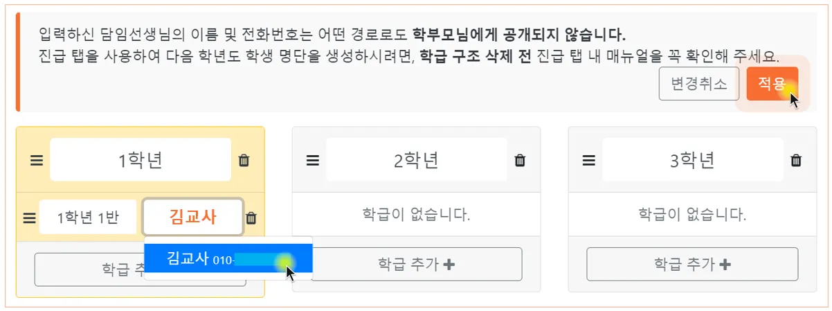 2. 그룹명 및 학급명을 알맞게 변경하고, 자동 검색되는 학급별 담임선생님 이름을 클릭하여 지정한 뒤 ‘적용’ 버튼을 누릅니다.