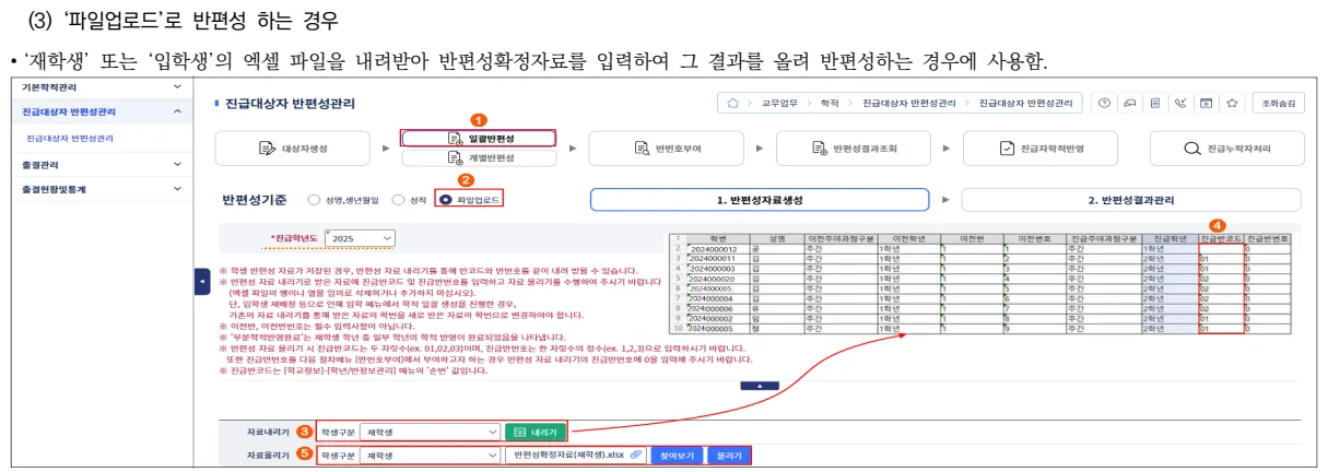 올해 학생 명단을 바탕으로 다음 학년·반으로 배정하는 단계입니다.