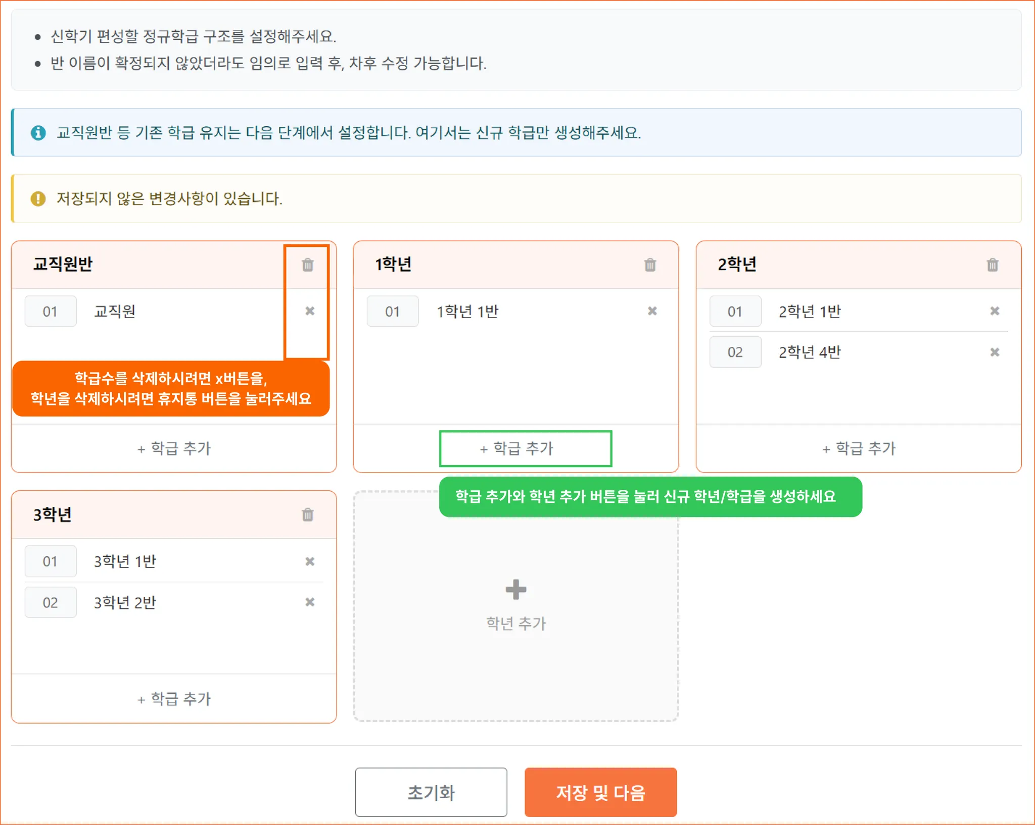 기존 학급 구조를 참고해 반을 추가하거나 삭제할 수 있습니다.