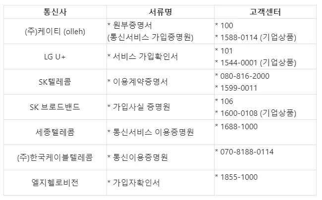 - 통신서비스 이용증명원은 사용하고 계신 통신사의 고객센터에 요청하시면 받으실 수 있습니다.