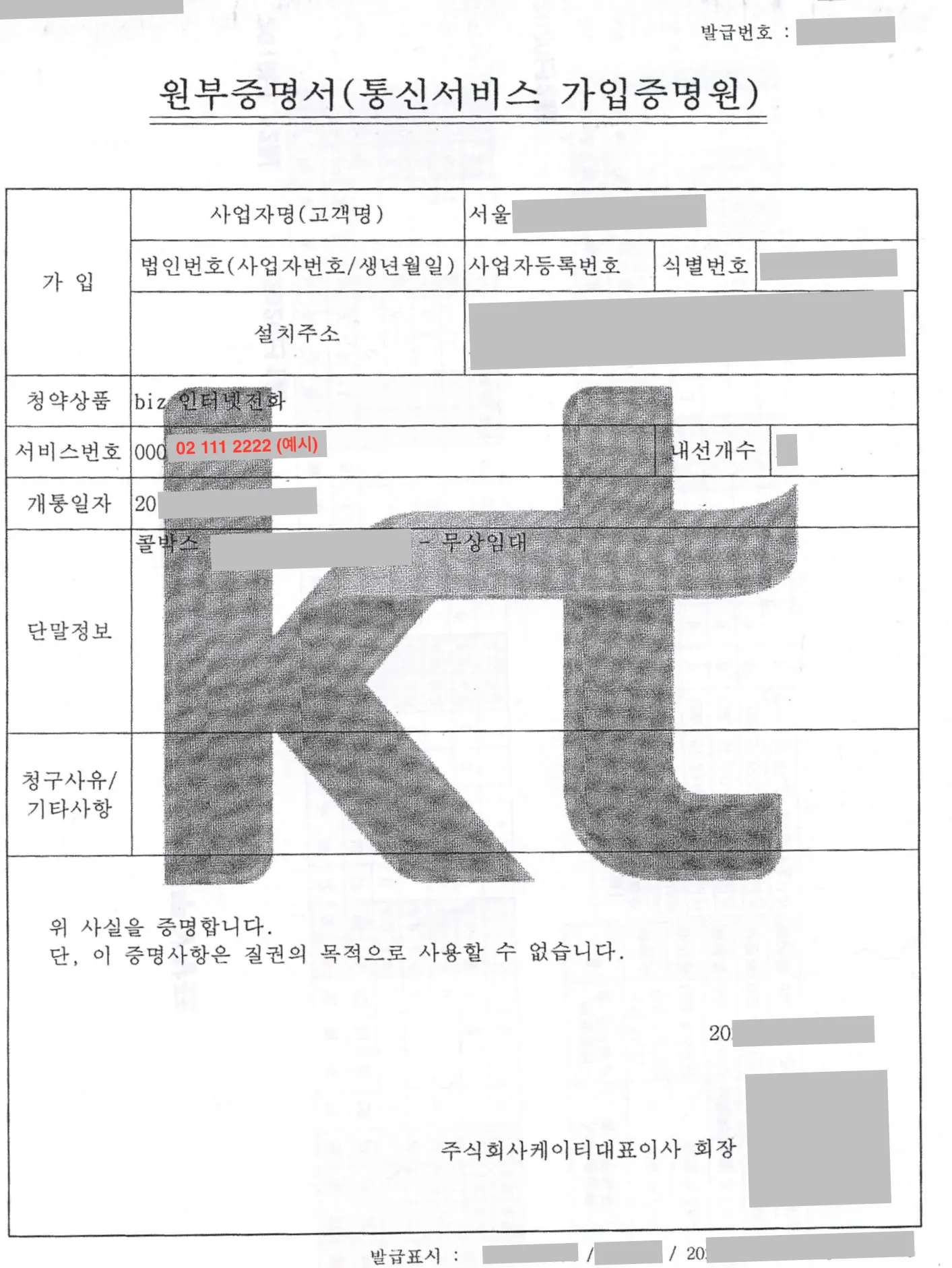 - 발신번호 등록 요청하시는 전화번호와 동일한 전화번호만 나와있는 통신서비스 이용증명원을 첨부해주셔야 합니다.