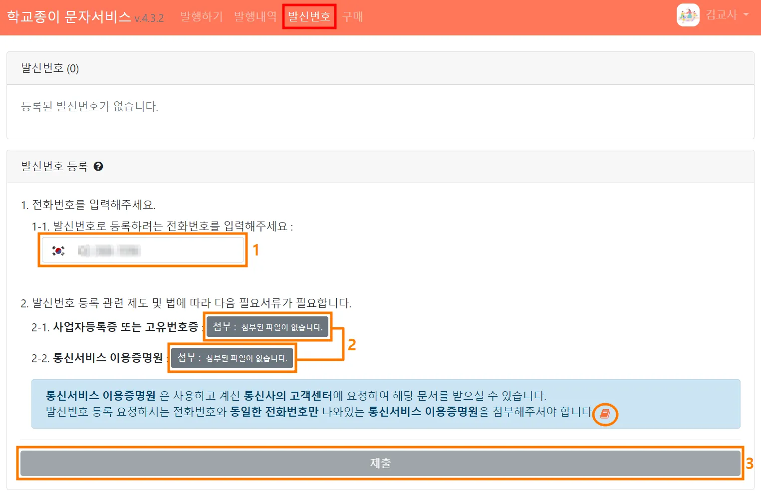 제출 (영업일 기준 2~3일내에 인증완료 후 발신번호가 등록됨)