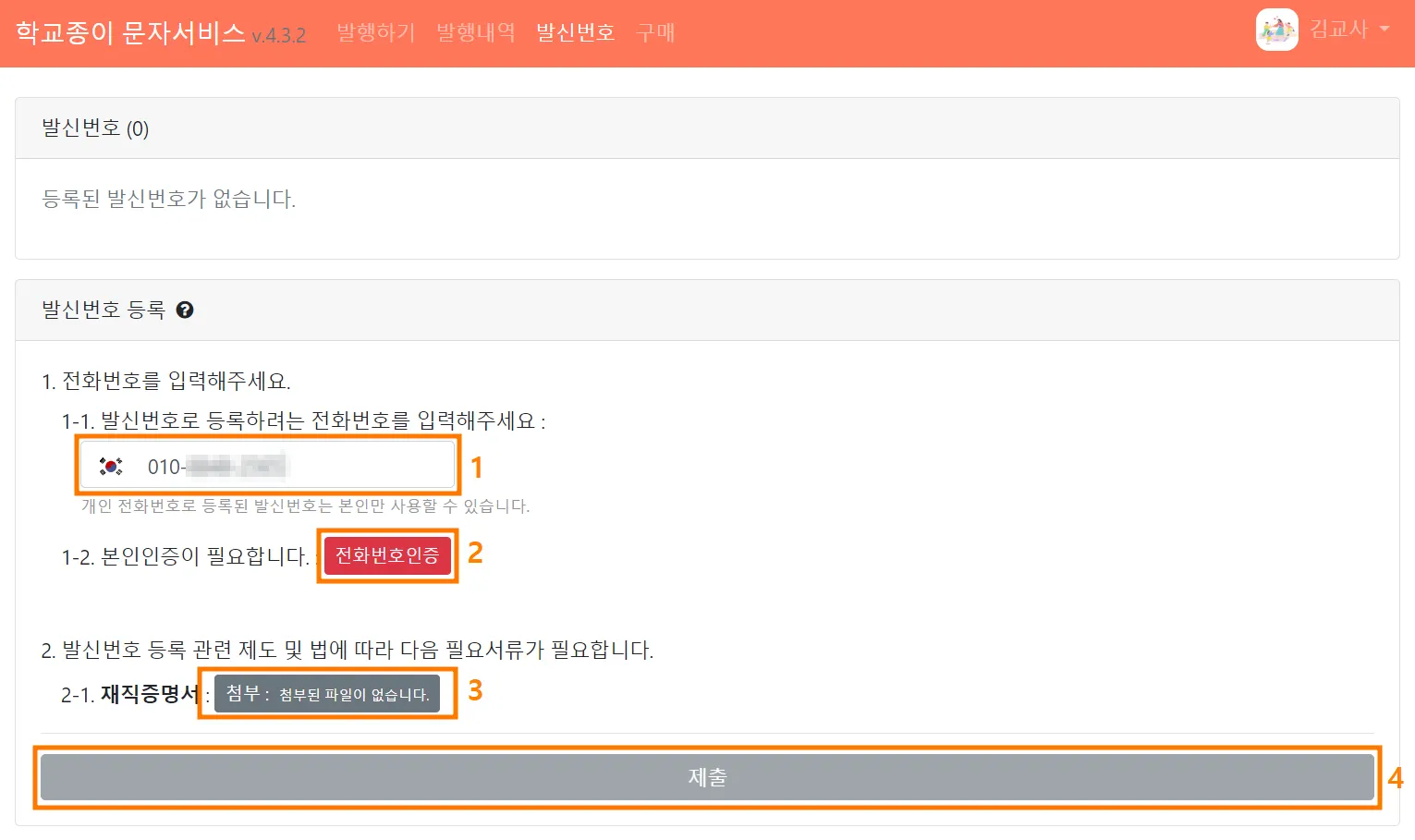 학교종이를 통해 특정 번호로 문자 발송을 원하실 경우, 발신번호를 먼저 등록해 주셔야 합니다.