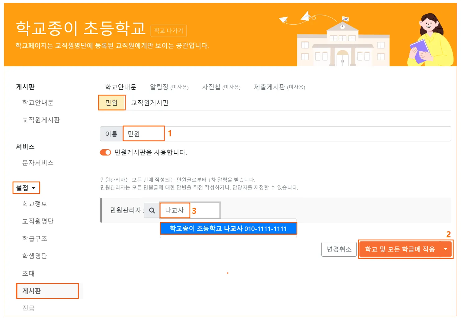 (2) ‘민원관리자’ 검색창에 민원전담팀 역할을 할 교직원 이름을 입력3하여 선택한 후 ‘학교 및 모든 학급에 적용’2을 누릅니다.