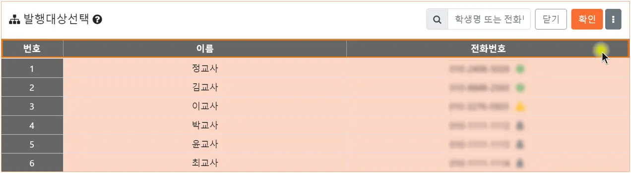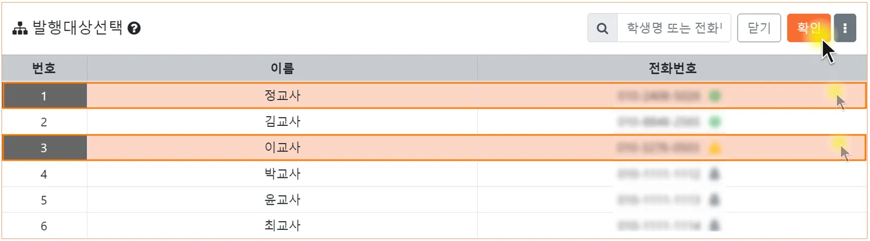 이 때 원하는 교직원 이름 행을 클릭하면 배경이 살구색으로 변경되면서 발행대상으로 선택됩니다.