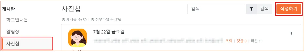 1. 학급페이지 > 사진첩 탭 > ‘작성하기’ 버튼을 누릅니다.