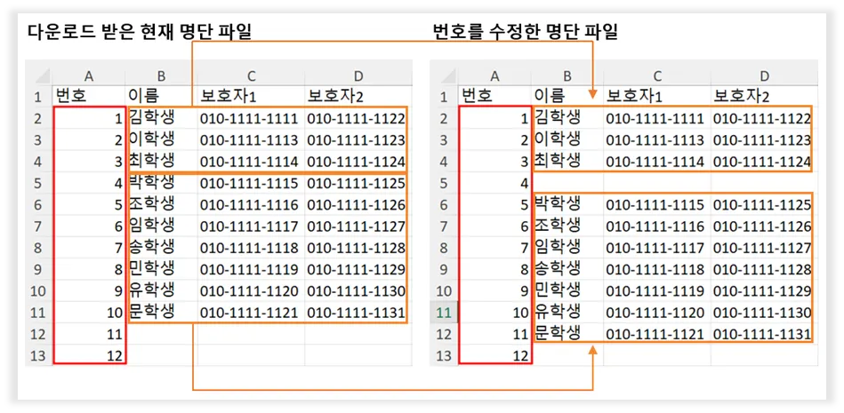 학생명단 화면에서 현재 명단을 엑셀로 내려받은 후 엑셀양식의 '번호'에 맞게 학생명단을 수정하여 적용하게 되면, 기존의 '수락'상태는 그대로 유지 됩니다.
