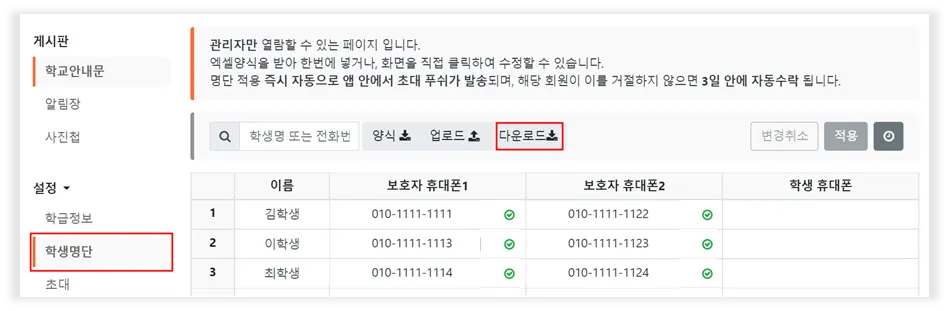 1. 학생명단 화면에서 현재 명단을 '다운로드' 받습니다.