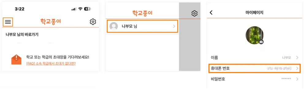 학교종이 앱 >마이페이지를 통해 현재 로그인된 휴대폰번호 확인 시 이상이 없다면,