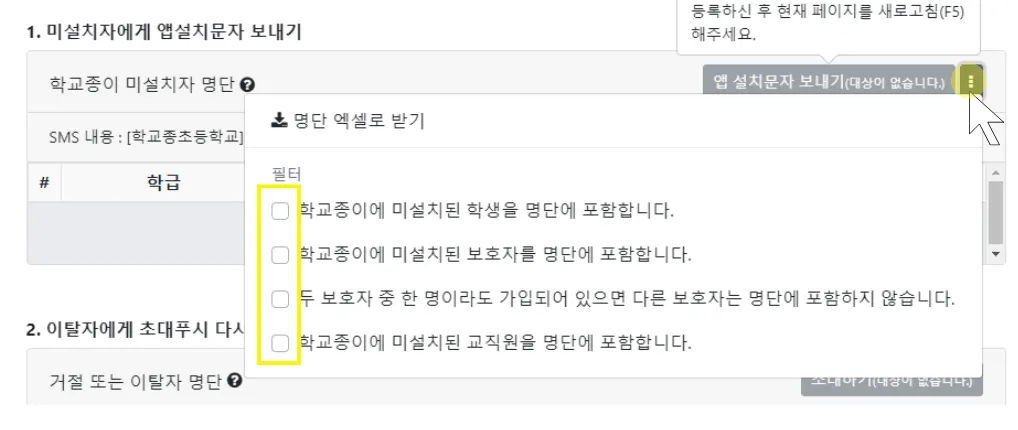 학교종이 어플 미설치자 또는 회원가입을 하지 않은 분들에게 가입 유도 문자를 보낼 수 있습니다.
