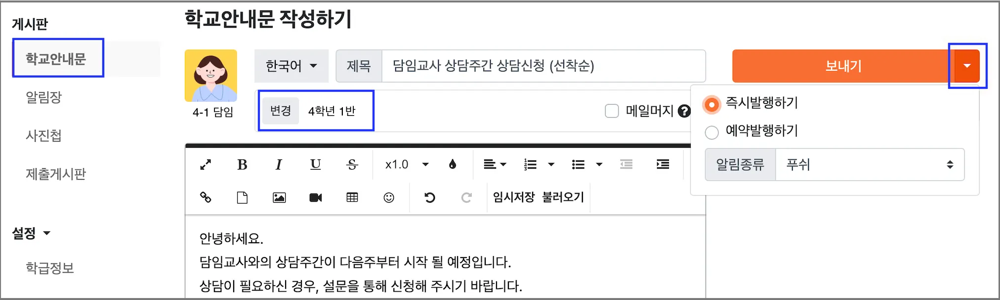 담임선생님 로그인 > 우리반페이지 > 학교안내문 또는 알림장 탭 > 작성하기 > 설문첨부 > 담임교사 상담주간 상담신청 클릭
