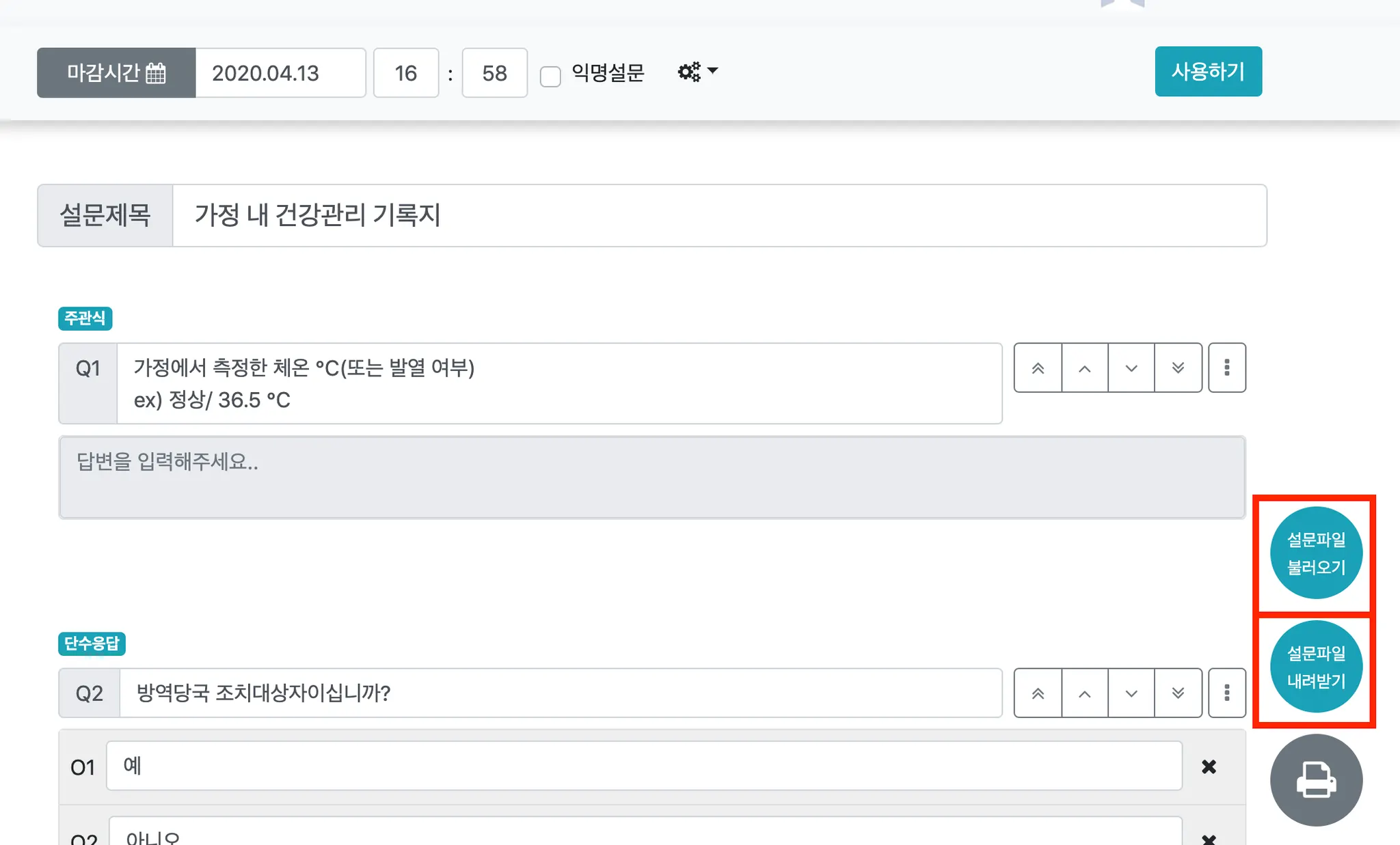 만드신 설문 화면의 우측 하단 '설문 파일 내려받기' 해 주시면 json이라는 특이한 형식의 파일이 '다운로드' 폴더에 받아집니다.