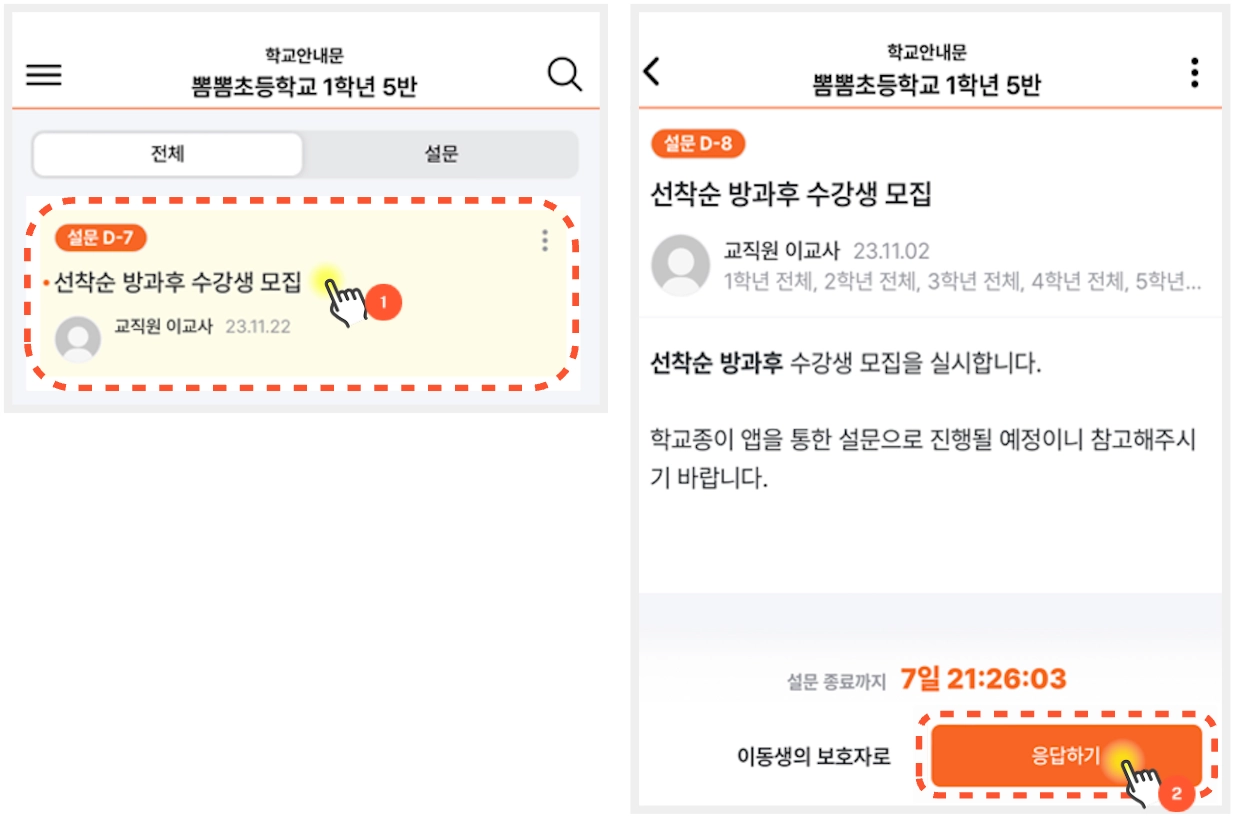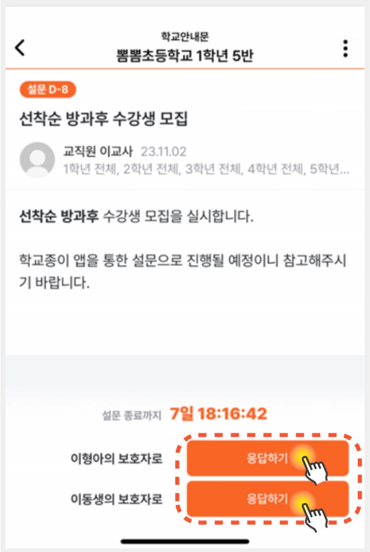 설문글을 누르면 응답하기 버튼 2개가 보입니다. 한 명씩 응답하기 버튼을 눌러 설문에 응답합니다.