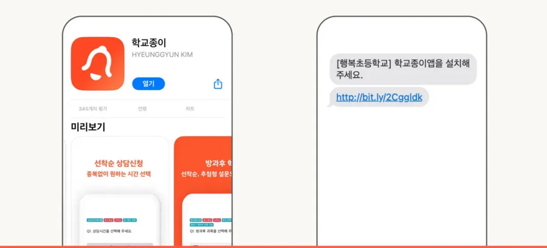 1) 플레이스토어(앱스토어)에서 ‘학교종이’를 검색하거나, 학교로부터 온 문자링크를 터치하여 학교종이앱을 설치합니다.