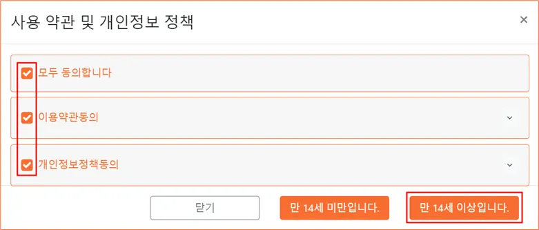 '모두 동의합니다'에 체크 후 “만 14세 미만입니다”를 클릭합니다.