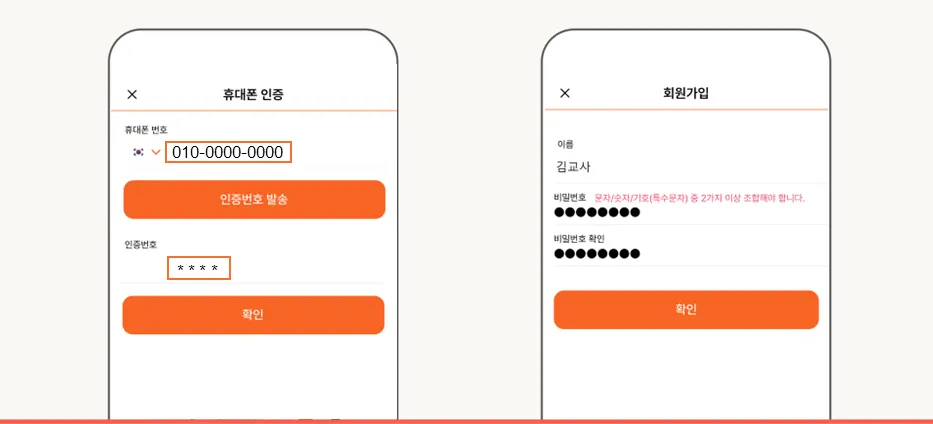 3) 휴대폰번호 입력 > ‘인증번호 발송’ > 휴대폰 문자로 받은 인증번호 4자리 입력 > ‘확인’ > 이름, 설정할 비밀번호(문자, 숫자, 기호 중 2가지 이상 조합하여 8자리 이상 입력)를 2회 입력 > ‘확인’을 누르면 회원가입이 완료되어 자동로그인 됩니다.