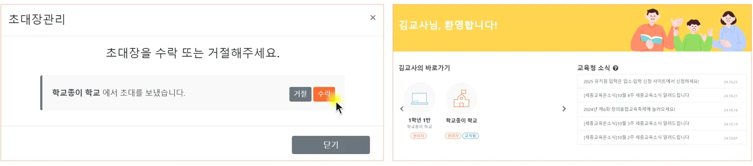 가입 후 로그인이 되면, 소속학급(또는 학교)로부터 온 초대장을 확인할 수 있으며,’ 수락’을 누르면 'OOO의 바로가기'를 통해 소속학급(또는 학교) 페이지로 들어가 보실 수 있습니다.
