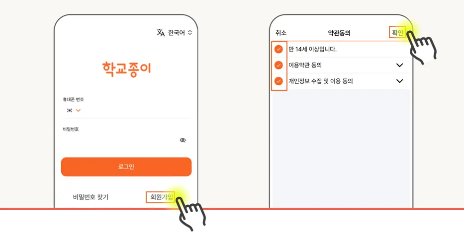 2) ‘회원가입’을 누른 후 약관 동의를 체크하고 ‘확인’을 누릅니다.