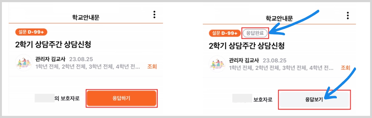 제출된 응답 내용을 확인하거나 수정하여 다시 제출하고 싶을 때에도 '응답보기'를 눌러주시면 됩니다.