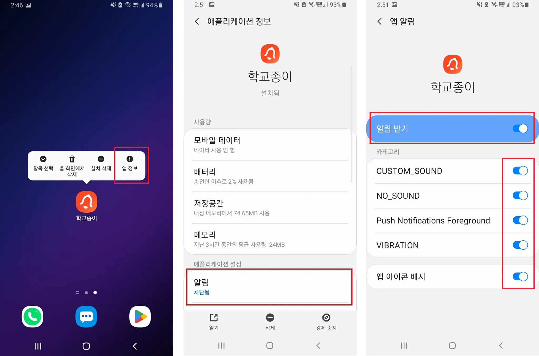 학교종이 어플을 2초 이상 누르기 → 앱 정보 → 알림 → ‘알림 받기’ 체크, 카테고리별 활성화