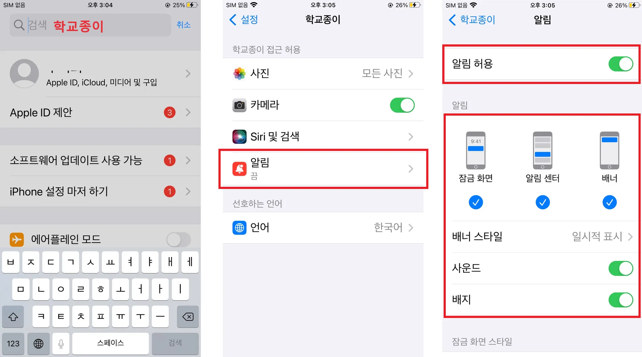설정 → ‘학교종이’ 검색 → 알림 → ‘알림 허용’ 체크, 각 옵션 활성화