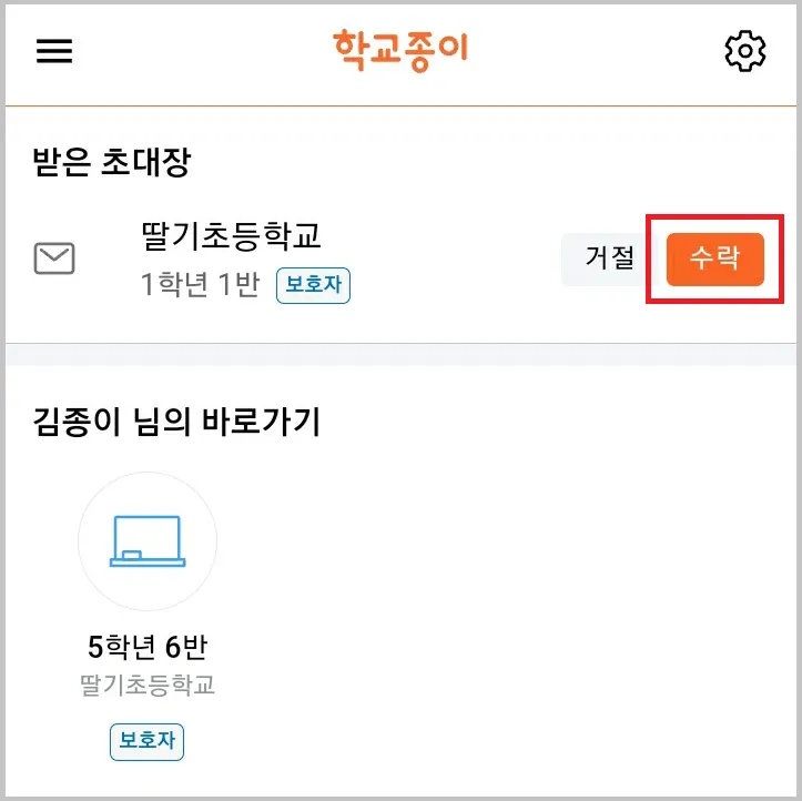 학교종이 앱 메인 상단 > 받은 초대장 > 수락 하기
