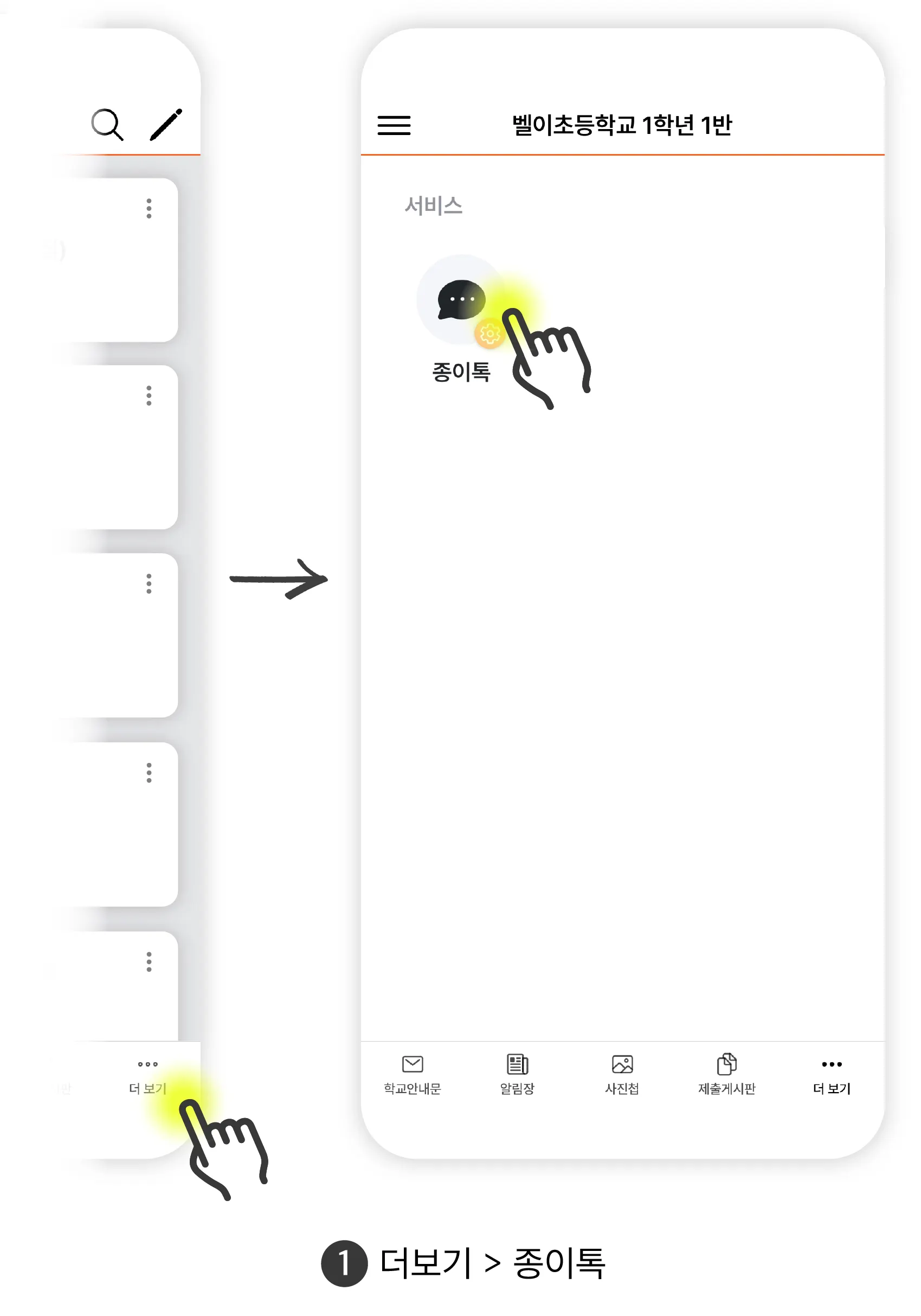 먼저 담임선생님께서 종이톡 사용 설정을 해주셔야 합니다. 최신 버전으로 앱을 업데이트 하면 기존 종이콜 대신 종이톡 아이콘이 보일거에요. 이 아이콘 안에 통화와 채팅기능이 같이 들어가 있습니다. 나의 학급 > 우측하단 더보기 > ❶ 종이톡 > ❷ 설정 화면에서 종이콜, 종이챗 개별 활성화 해주시면 바로 이용하실 수 있습니다.