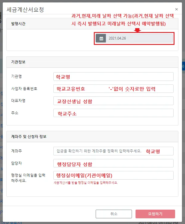 세금계산서 내용 입력 > 요청하기
