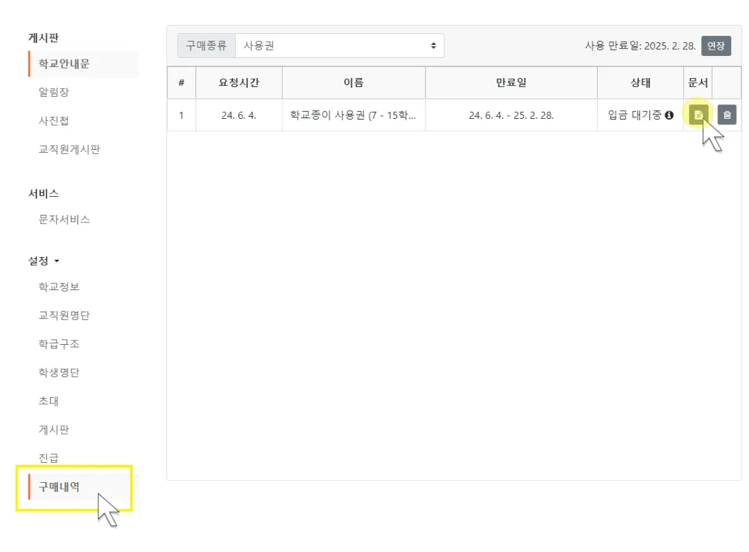 학교종이 학교 사이트 > 설정 > 구매내역 > 오른쪽 활성화된 메뉴 > 문서 이모티콘 클릭