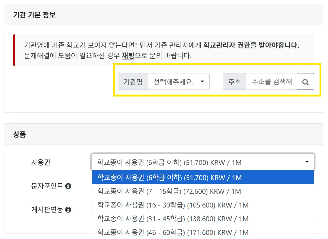재구매 신청은 학교정보 에 등록되어 있는 관리자 분들만 신청 가능합니다.