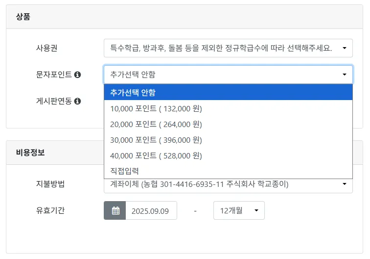 상품 > 문자포인트 > 포인트 개수 선택 직접입력의 경우 1.000포인트 이상 입력 가능