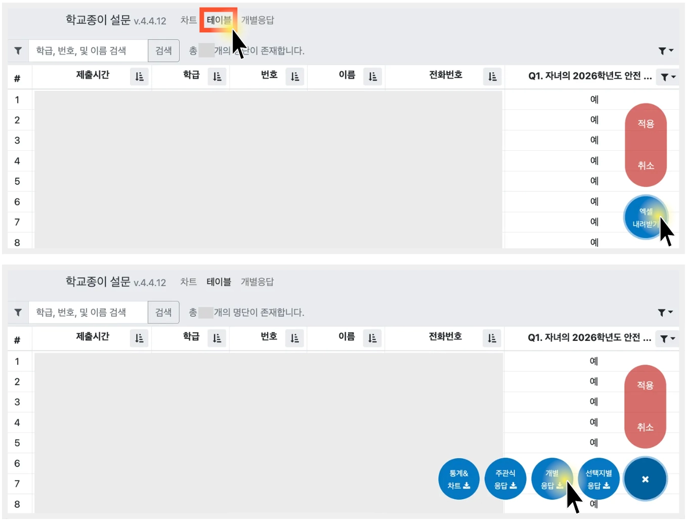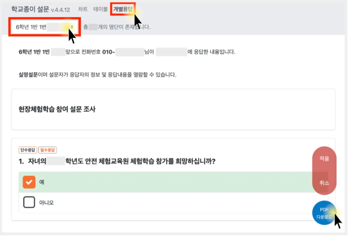 개별응답 : 선택한 각 응답자의 개별응답 화면 확인