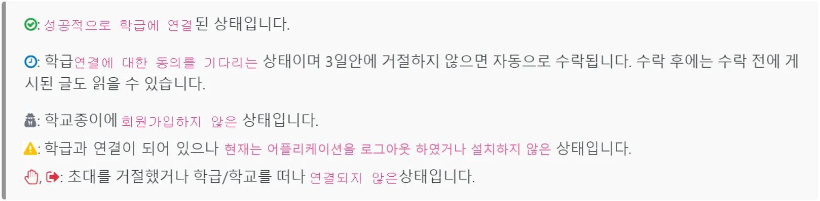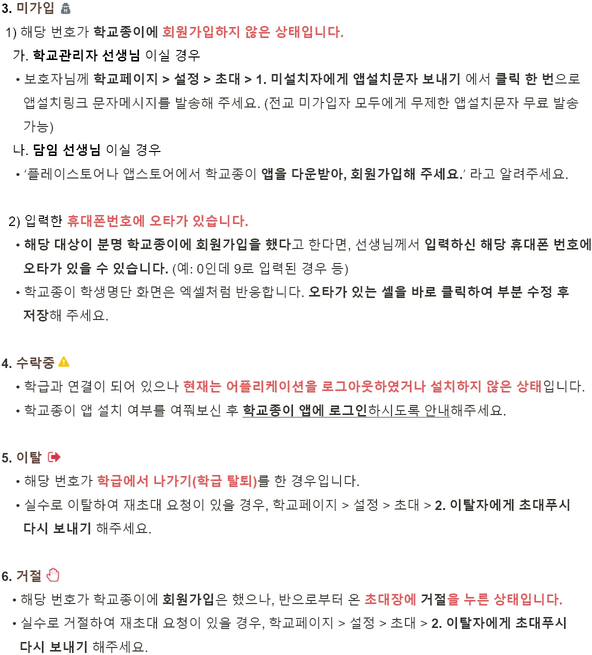 A. 학기 초, 학생명단에 학생 이름과 보호자 휴대폰번호들을 적용하면, 각 연락처 옆 뱃지가 표시되어 구성원들의 상태를 확인하실 수 있습니다.