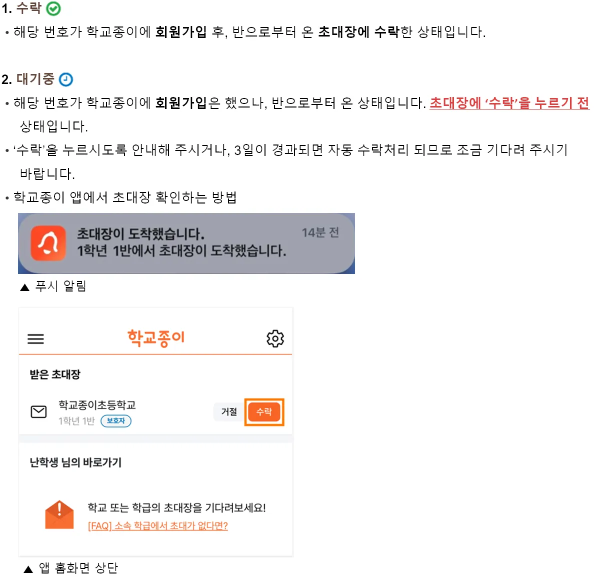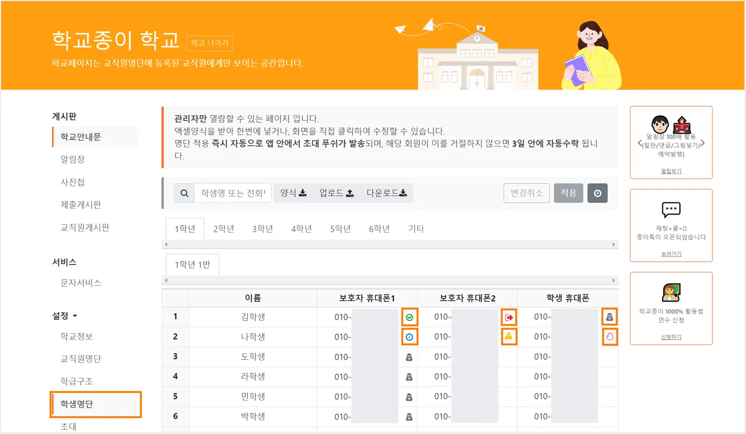 ▲ 학교페이지 / 학급페이지 학생명단에서 볼 수 있는 각 휴대폰번호의 상태 뱃지