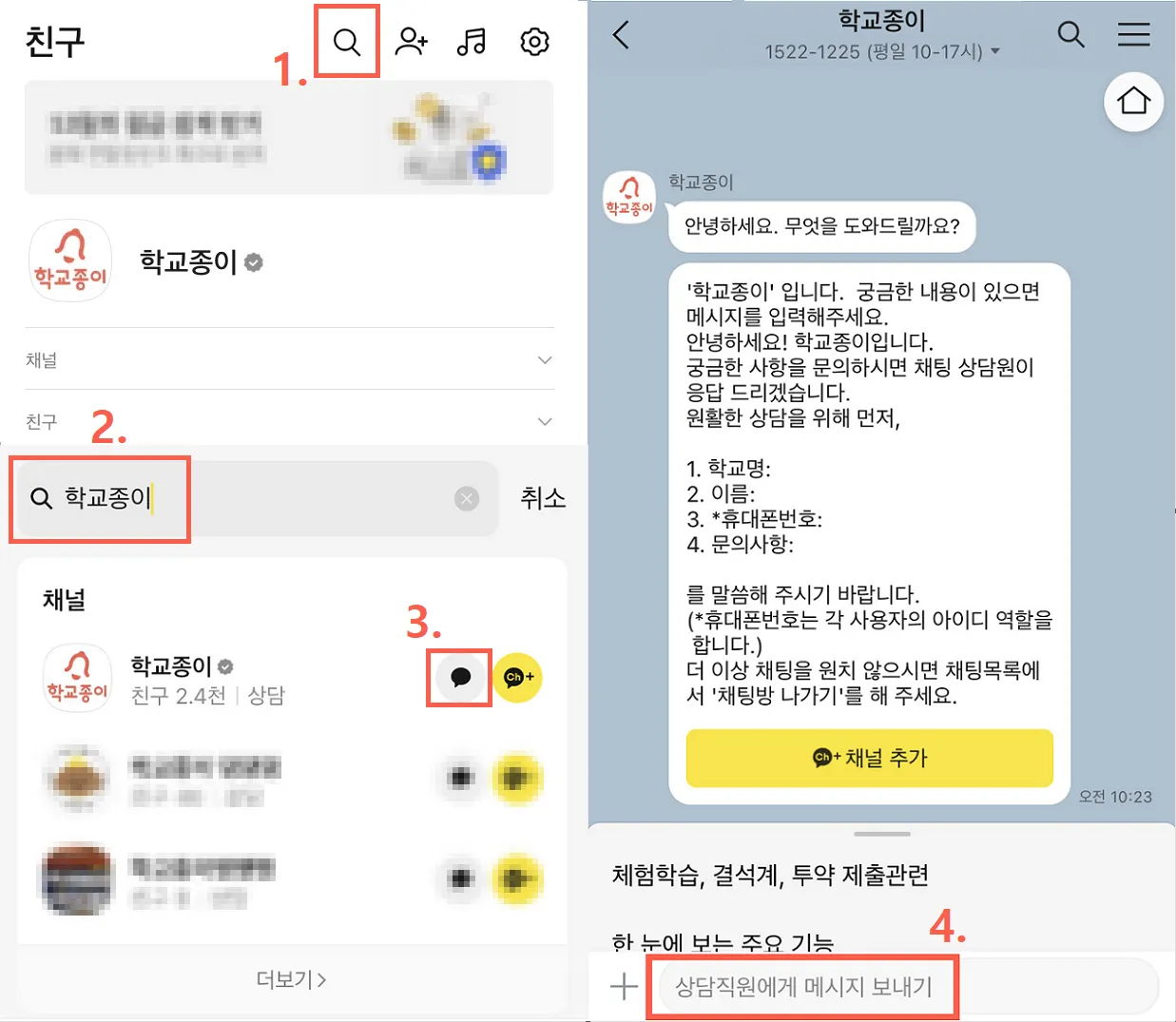 *카카오톡 친구찾기(우측 상단 돋보기 버튼 누르기) > ‘학교종이’ 검색 > 상담원 채팅