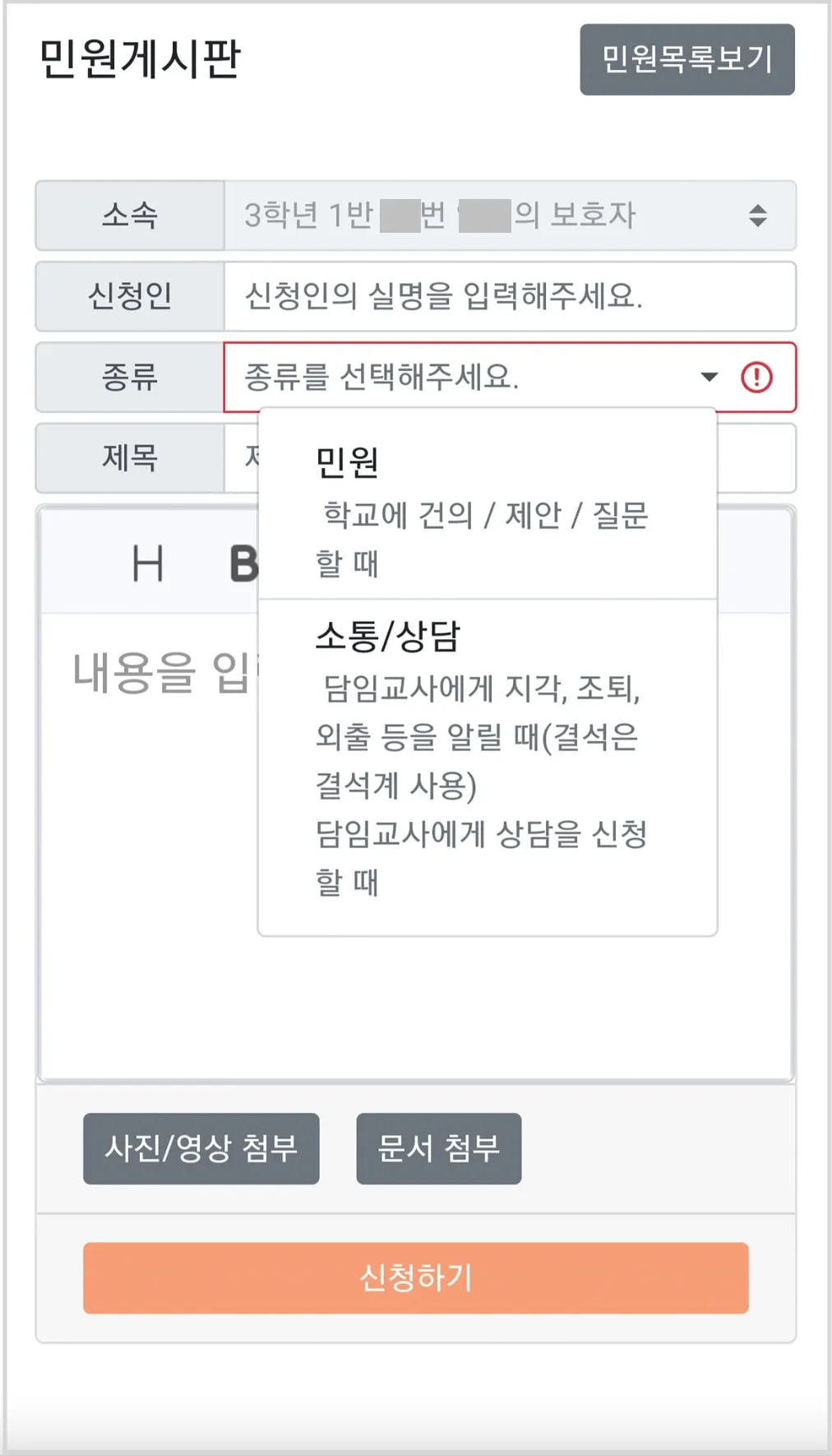 ▲민원작성중인 보호자 앱화면